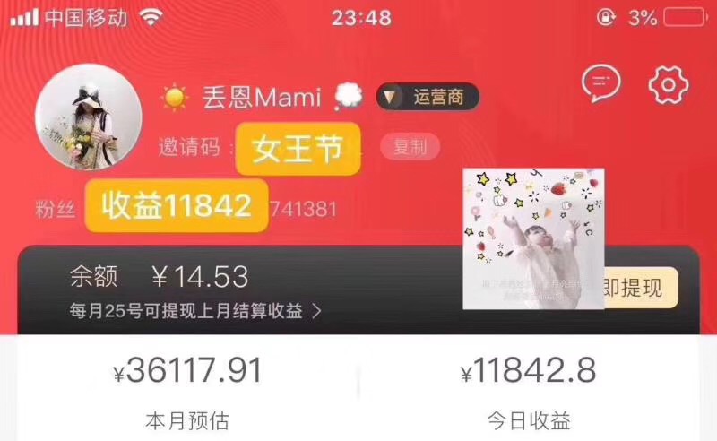 还有人问花生日记赚钱吗?对了,刚刚过完女神节,群里的运营商大神们都爆单了,随手找了几个图,赚不赚钱大家自己看看吧,如果想做,请记住:一定一定努力升级运营商,因为超级会员只适合自己使用。