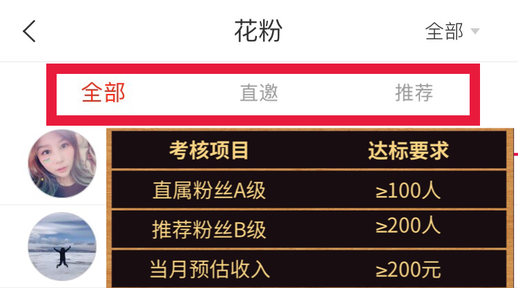 上图中下面的要求分别对应上面的全部、直邀、和推荐。